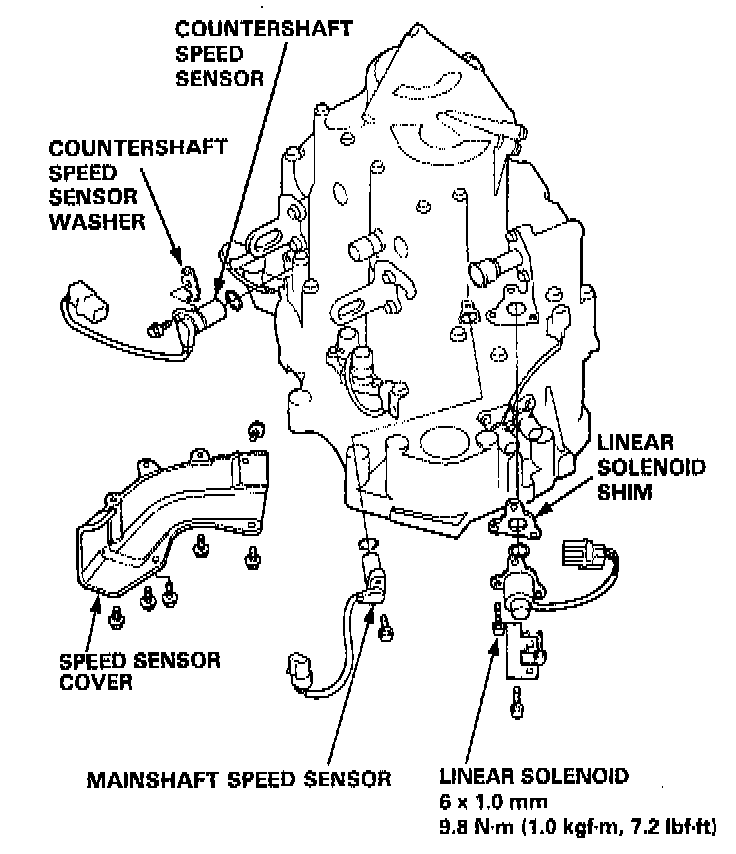 14. Install the countershaft and mainshaft speed sensors, vehicle speed sensor cover, and linear solenoid.