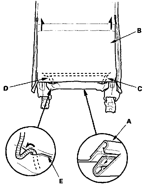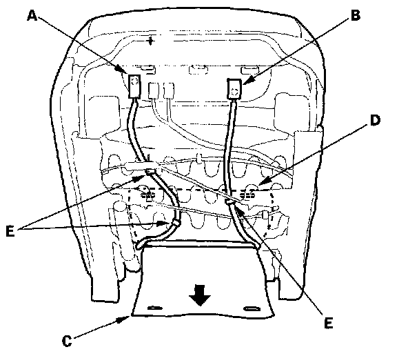 2. From under the seat cushion, detach the side airbag connector clip (A), and on the passenger's seat, detach the OPDS unit connector clip (B). Release the seat cushion cover (C) from the seat cushion frame spring (D), then pull the cover back, and remove the harness bands (E). The passenger's seat is shown, the driver's seat is symmetrical except it has no OPDS unit connector.