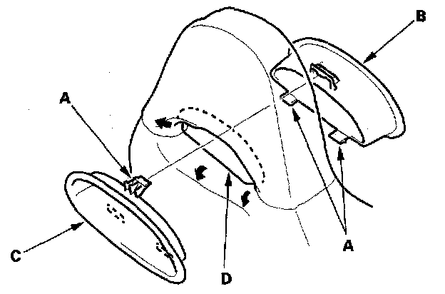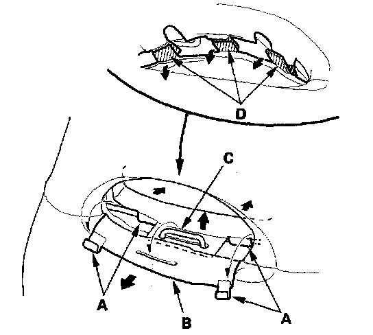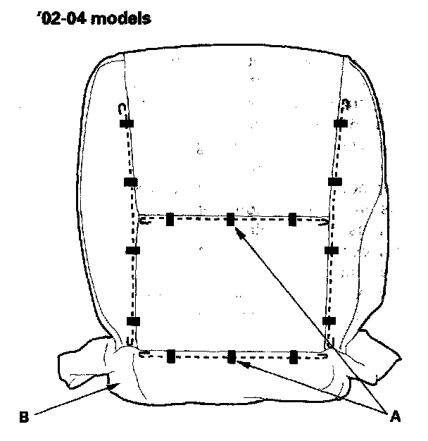 6. 05-06 models: Release the hooks (A), and release the seat-back cover (B) from the wire loop (C) on the seat-back frame. Release the fasteners (D), and then pull back the seat-back cover.
