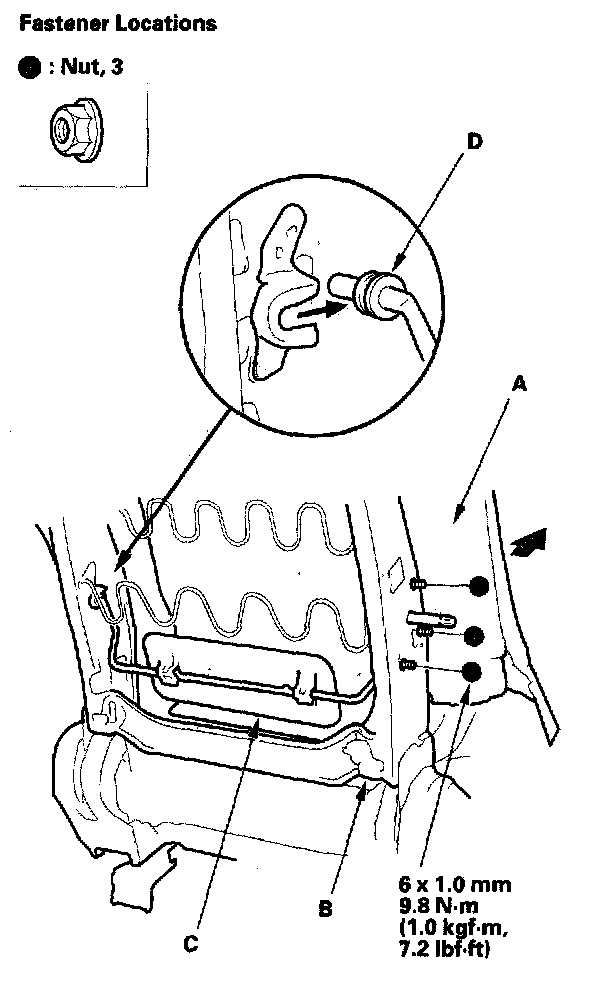6. Pull away the bottom portion of the seat-back pad (A) from the seat-back frame (B), and remove the nuts securing the lumbar support (C). Remove the bushing (D) and pivot arm from the seat-back frame.