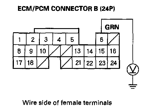 9. Measure the voltage between the No.6 terminal of ECM/PCM connector B (24P) and body ground with the ECM/PCM connectors connected.