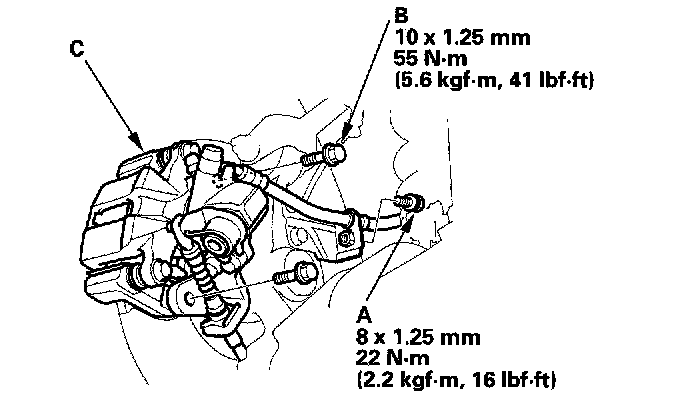 5. Remove the caliper bracket mounting bolts (B), and hang the caliper (C) to one side. To prevent damage to the caliper or brake hose, use a short piece of wire to hang the caliper from the undercarriage.