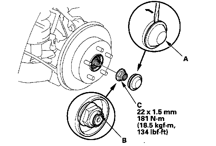 6. Remove the hub cap (A), raise the stake (B), and remove the spindle nut (C).