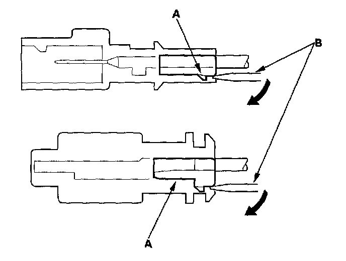 When checking voltage or resistance on this type of connector the first time, you must remove the retainer to insert the tester probe from the wire side.NOTE: It is not necessary to reinstall the removed retainer; the terminals will stay locked in the connector housing.