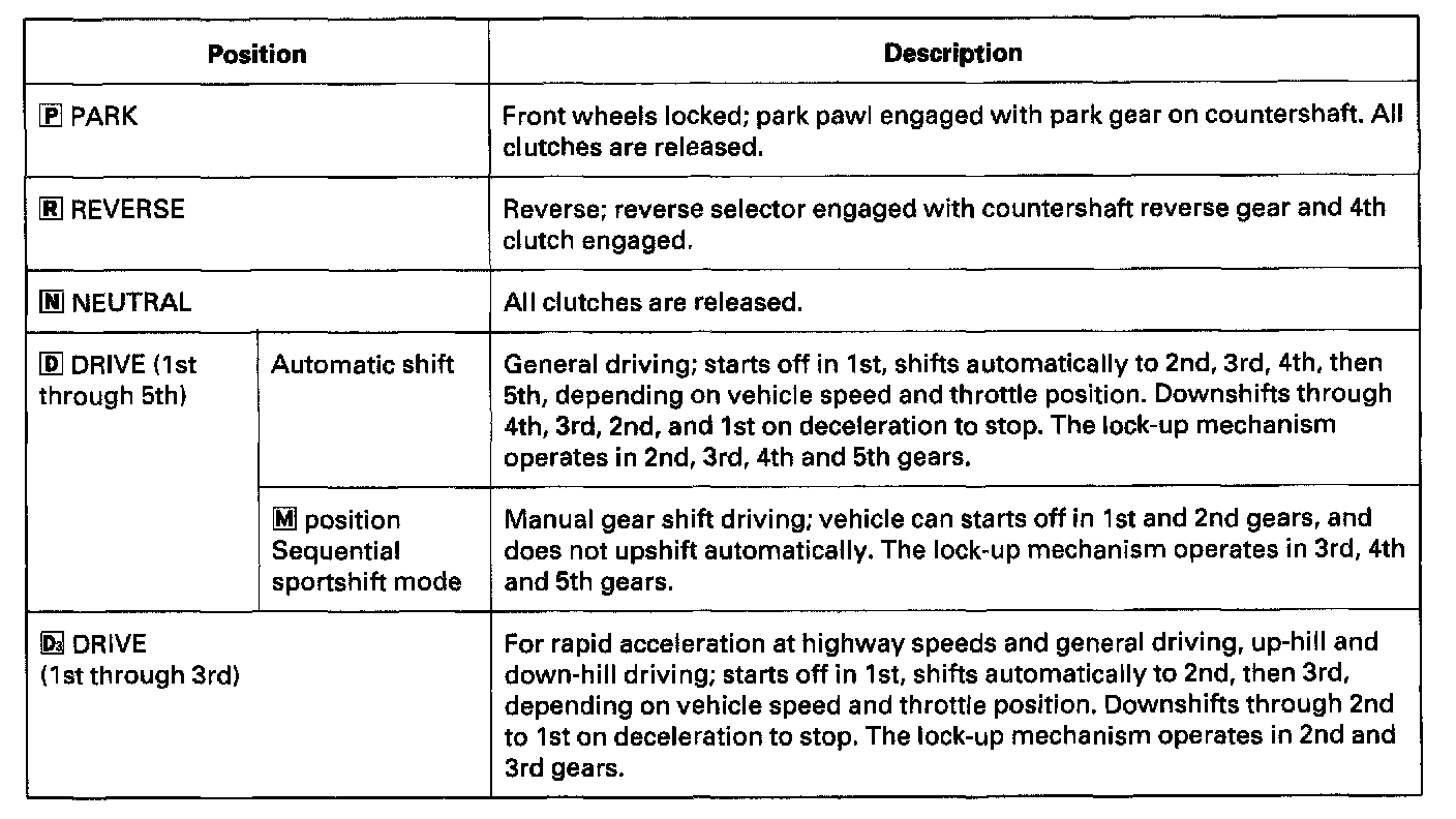 The shift lever has five positions: P PARK, R REVERSE, N NEUTRAL, D DRIVE 1st through 5th gear range with automatic shift and sequential sportshift in M (sequential sportshift mode) position, and D3 DRIVE 1st through 3rd gear range with automatic shift.