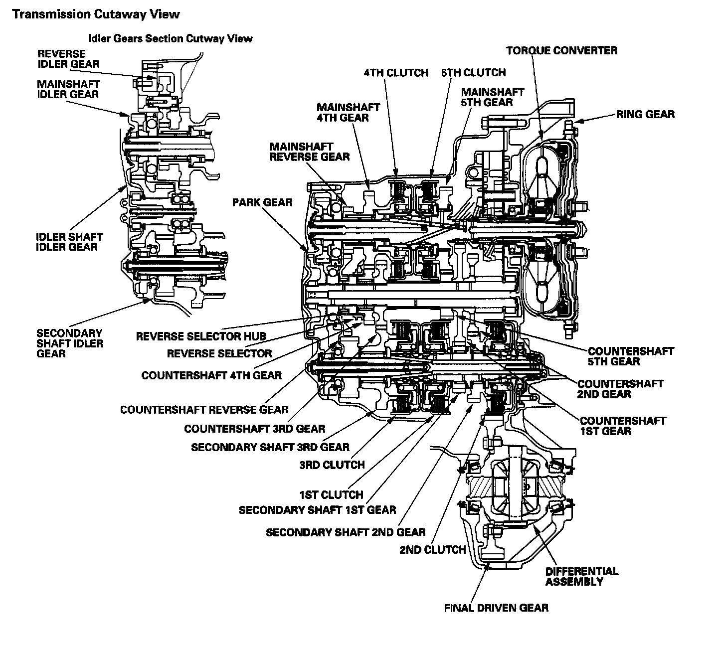 The torque converter consists of a pump, turbine, and stator assembly in a single unit. They are connected to the engine crankshaft so they turn together as the engine turns. Around the outside of the torque converter is a ring gear which meshes with the starter pinion when the engine is being started. The entire torque converter assembly serves as a flywheel while transmitting power to the transmission mainshaft, the transmission has three parallel shafts; the mainshaft, the countershaft, the secondary strafe. The mainshaft is in line with the engine crankshaft, and includes the 4th and 5th clutches, and gears for 5th, 4th, reverse, and idler. The mainshaft reverse gear is integral with the mainshaft 4th gear. The countershaft includes the gears for 1st, 2nd, 3rd, 4th, 5th, reverse, park, and the final drive. The final drive gear is integral with the countershaft. The countershaft 4th gear and the countershaft reverse gear can be locked to the countershaft providing the 4th or reverse gear, depending on which way the selector is moved. The secondary shaft includes the 1st, 2nd, and 3rd clutches, and gears for 1st, 2nd, 3rd, and idler. The idler shaft is located between the mainshaft and secondary shaft, and the idler gear transmits power between the mainshaft and the secondary shaft. The gears on the mainshaft and the secondary shaft are in constant mesh with those on the countershaft. When certain combinations of gears in the transmission are engaged by the clutches, power is transmitted from the mainshaft and the secondary shaft to the countershaft provide D, D3, M, and R positions.
