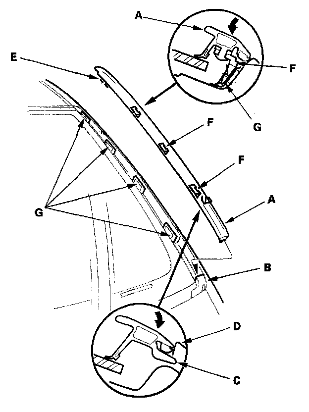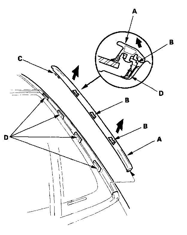 1. Pull up the side trim (A) to release the clips (B, C) from the retainers (D), then remove the trim from each side of the windshield.