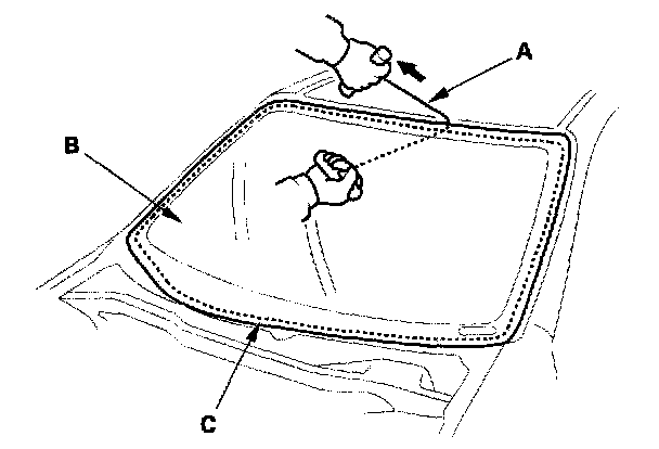 7. With a helper on the outside, pull the piano wire (A) back and forth in a sawing motion. Hold the piano wire as close to the windshield (B) as possible to prevent damage to the body and dashboard. Carefully cut through the rubber dam and adhesive (C) around the entire windshield.
