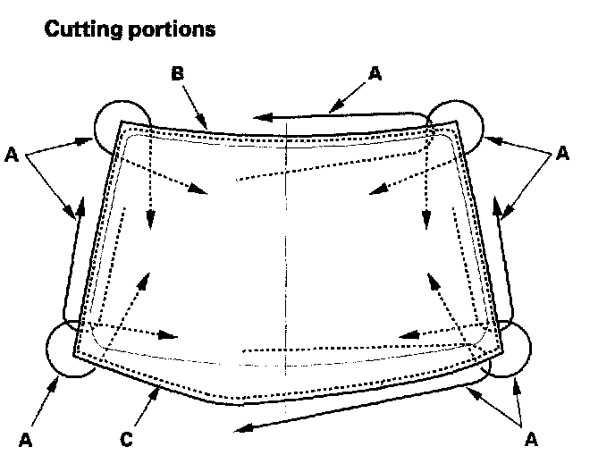13. Attach the molding (A) with adhesive tape (B) to the corner edge of the windshield (C). Be careful not to touch the windshield where adhesive will be applied.