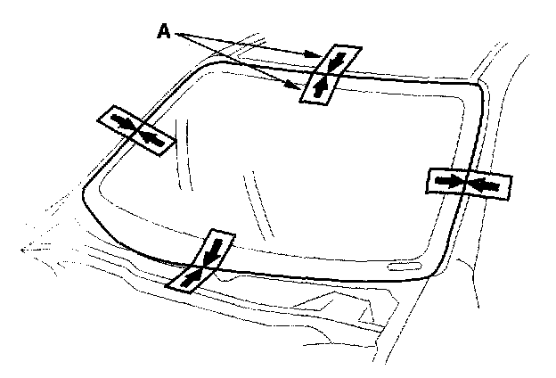 15. Set the windshield in the opening, and center it. Make alignment marks (A) across the windshield and body with a grease pencil at the four points shown. Be careful not to touch the windshield where adhesive will be applied.