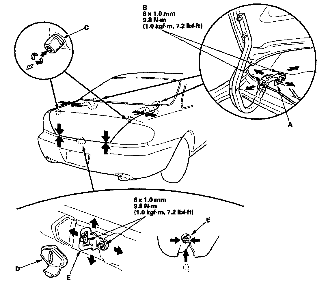 - Remove the trunk rear trim panel and striker cover (D), and adjust the fit between the trunk lid and the trunk lid opening by moving the striker (E).