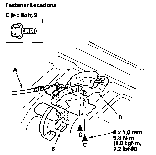 3. Remove the bolts (C), then remove the trunk lid latch (D).