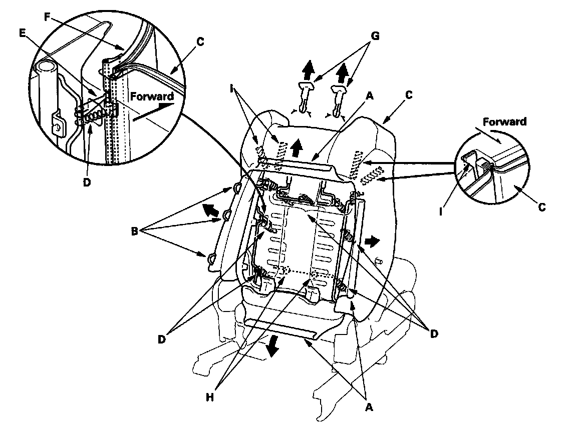 9. Pull back the edge of the seat-back cover all the way around. Release the clips (H) and fasteners (I) from under the seat-back cover, then remove the seat-back cover.