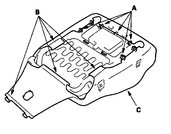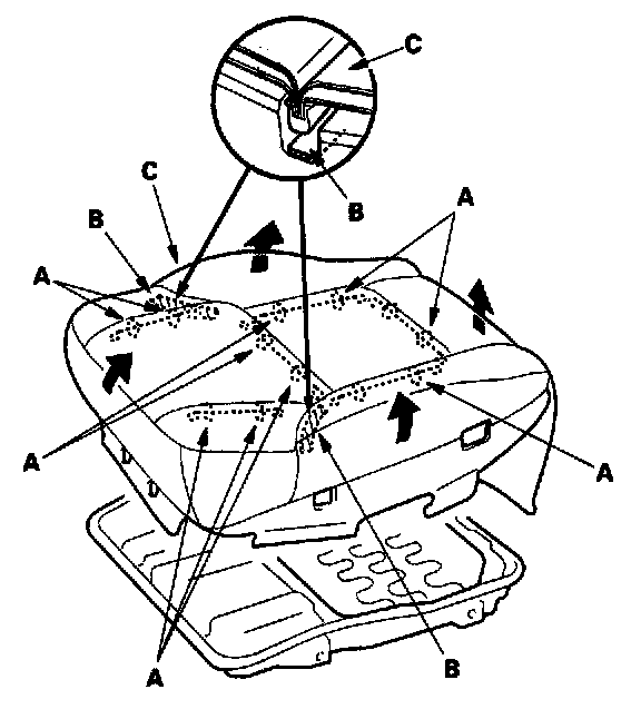 5. Pull back the edge of the seat cushion cover all the way around. Release the clips (A) and fasteners (B) from under the seat cushion cover (C), then remove the seat cushion cover.