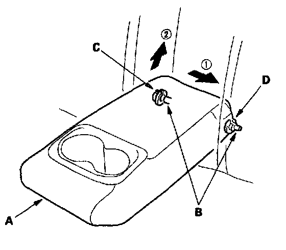 2. Remove the pivot shaft (B) from the collar (C) on the passenger's side of the vehicle by pulling up on the armrest, and remove the pivot shaft (B) from the collar (D) by pulling up on the armrest.