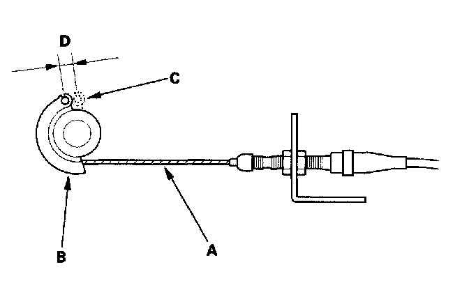 3. Measure the amount of movement of the output linkage (B) until the engine speed starts to increase. At first, the output linkage should be located at the fully closed position (C). The free play (D) should be 3.75 ± 0.5 mm (0.15 ± 0.02 in.).