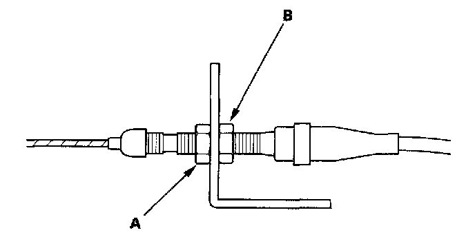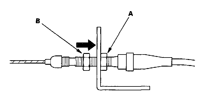 6. Pull the cable so that the adjusting nut (A) touches the bracket, then tighten the locknut (B).
