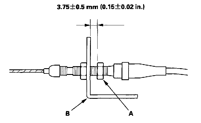5. Turn the adjusting nut (A) until it is 3.75 ± 0.5 mm (0.15 ± 0.02 in.) away from the bracket (B).
