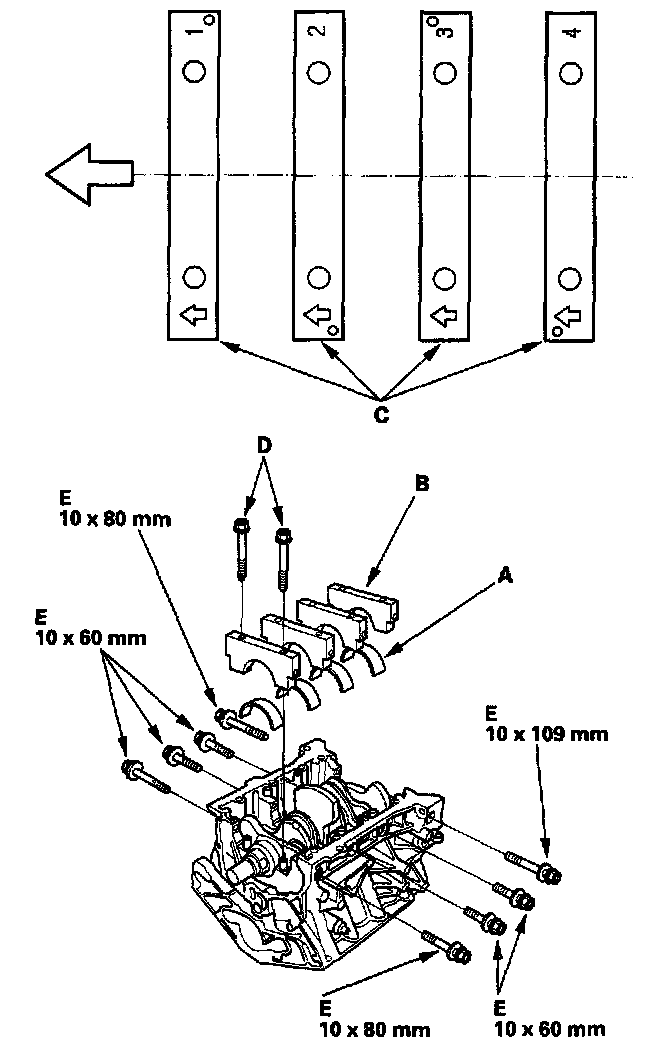 9. Apply engine oil to the bolt threads and flanges, then install the bearing cap bolts (D) and bearing cap side bolts (E).