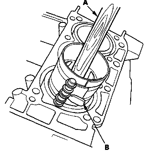 13. Position the piston in the cylinder, and tap it in using the wooden handle of a hammer (A). Maintain downward force on the ring compressor (B) to prevent the rings from expanding before entering the cylinder bore;