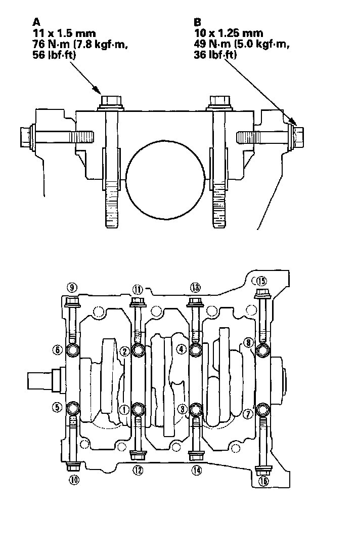 19. Torque the bearing cap bolts (A), then torque the bearing cap side bolts (B).