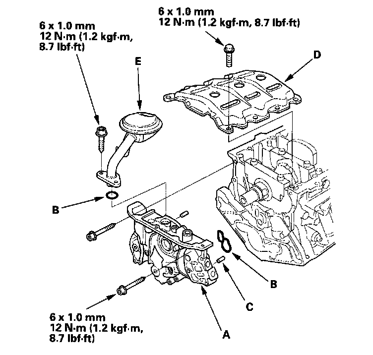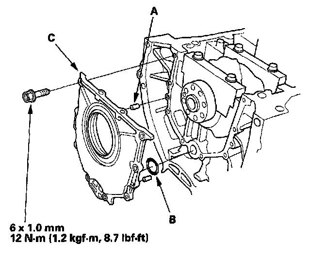 - 4 Install the dowel pins (C), then align the inner rotor with the crankshaft and install the oil pump.