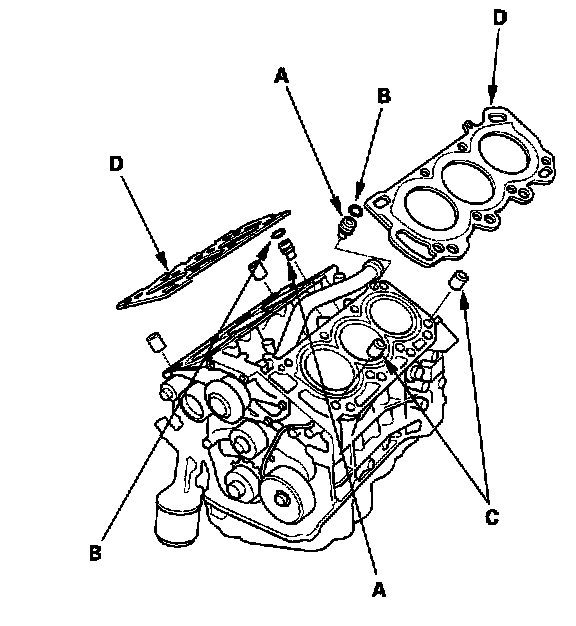 3. Install the dowel pins (C) and new cylinder head gaskets (D).