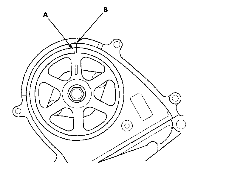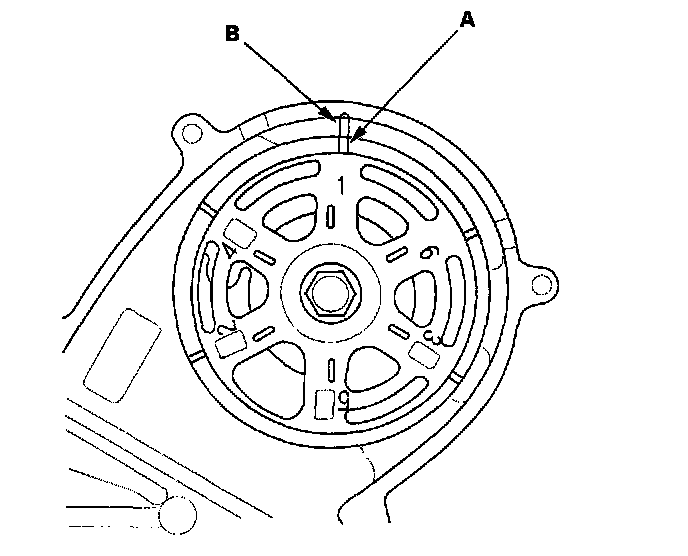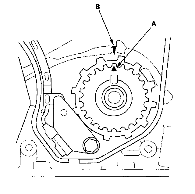 5. Set the timing belt drive pulley to top dead center (TDC) by aligning the TDC mark (A) on the tooth of the timing belt drive pulley with the pointer (B) on the oil pump.