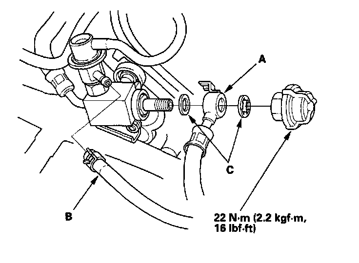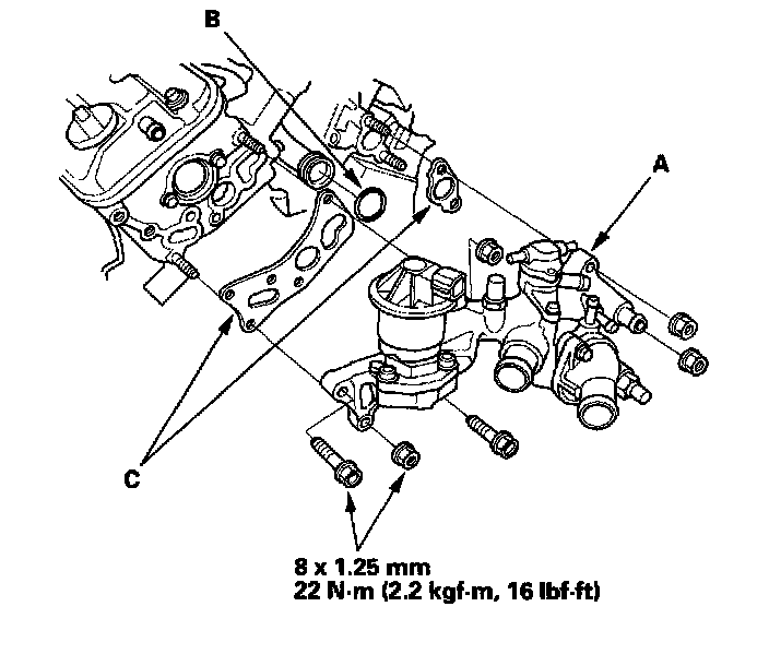 15. Install the water passage (A). Always use a new O-ring (B) and new gaskets (C).