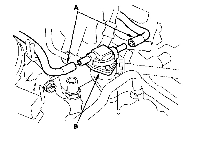 17. Install the vacuum hoses (A) on the intake air bypass control thermal valve (B).