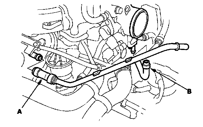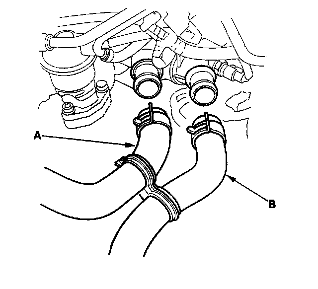 19. Install the upper radiator hoses (A) and lower radiator hose (B).