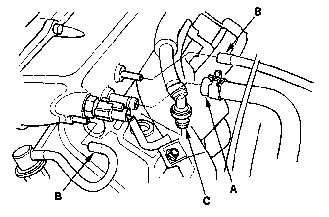 31. Install the brake booster vacuum hose (A), vacuum hoses (B) and Positive Crankcase Ventilation (PCV) hose (C).