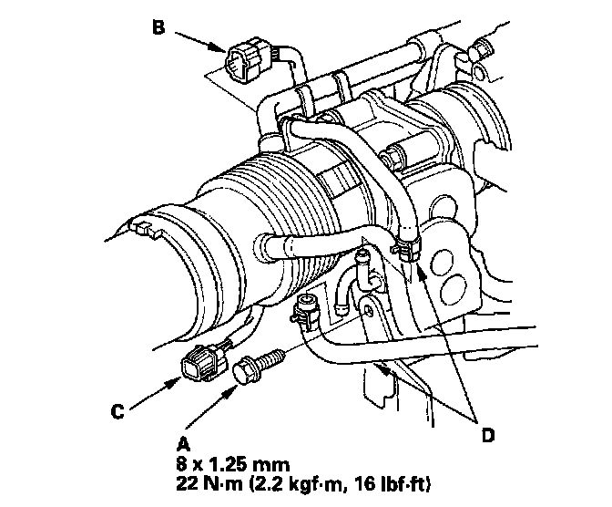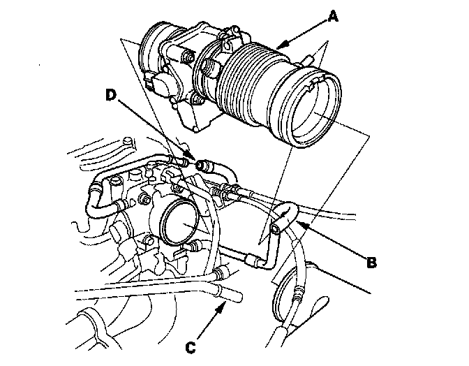 37. Tighten the bolt (A) securing the TCS control valve bracket. Connect the TCS control valve angle sensor connector (B), TCS control valve actuator connector (C) and water bypass hoses (D) on the TCS control valve assembly [J32A2 engine (A/T)].