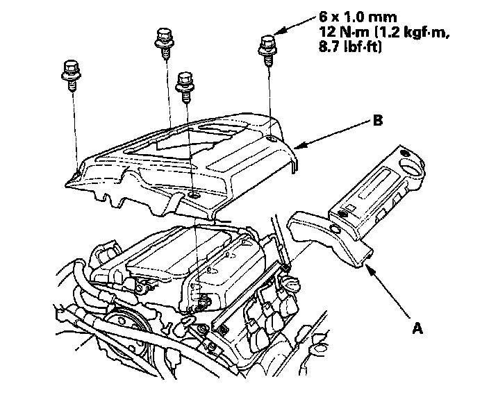 38. Install the ignition coil cover (A) and intake manifold cover (B).