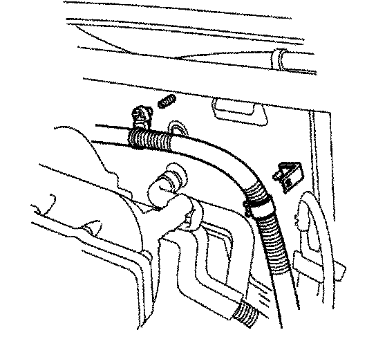 7. Connect the vacuum hose (D), and install the Power Steering (P/S) line (E) on its clamp.