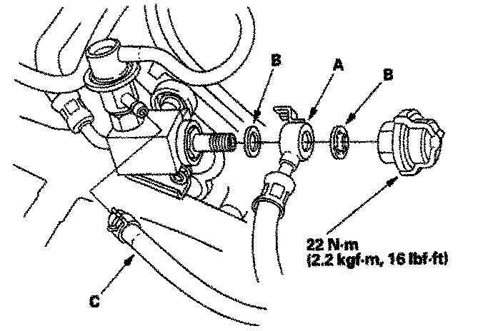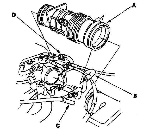 47. Install the intake air duct (A), then install the vacuum hose (B) and breather pipe (C).