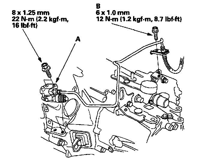 43. Install the clutch slave cylinder (A) and clutch line bracket mounting bolt (B) (M/T).