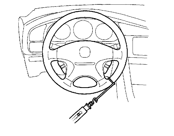 3. Attach a commercially available spring scale to the steering wheel. With the engine idling and the vehicle on a clean, dry floor, pull the scale as shown and read it as soon as the tires begin to turn.
