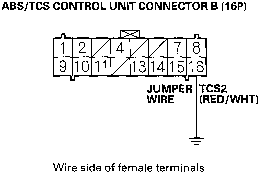 5. Remove the jumper wire at the gauge assembly, and connect the ABS/TCS control unit connector B (16P) terminal No. 16 and body ground with a jumper wire.