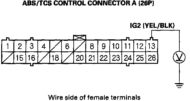 8. Measure the voltage between the ABS/TCS control unit connector A(26P) terminal No. 13 and body ground.