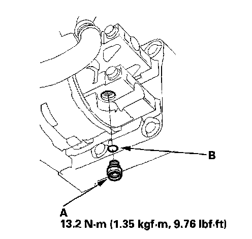 2. Remove the relief valve (A) and the O-ring (B). Plug the opening to keep foreign matter from entering the system and the compressor oil from running out.