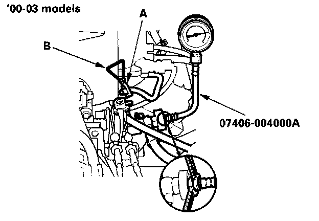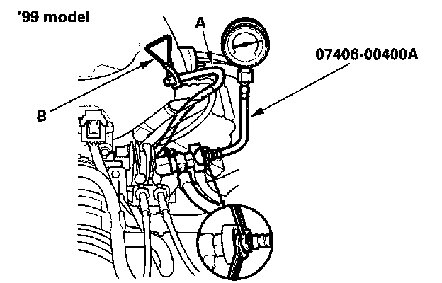 12. Read the pressure gauge (with the fuel pressure regulator vacuum hose disconnected and clamped). The pressure should be 280 - 330 kPa (2.9 - 3.4 kgf/sq.cm, 41 - 48 psi) for '99-00 models or 330 - 380 kPa (3.4 - 3.9 kgf/sq.cm, 48 - 55 psi) for '01-03 models.