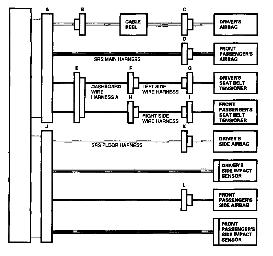 - Before disconnecting the SRS floor harness 14P connector (J) from the SRS unit, disconnect both side airbag 2P connectors (K, L).