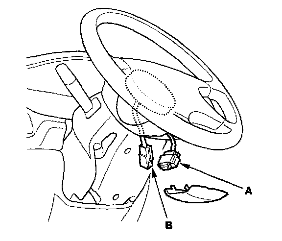 2. Remove the access panel from the steering wheel, then disconnect the driver's airbag 2P or 4P connector (A) from the cable reel 2P or 4P connector (B).
