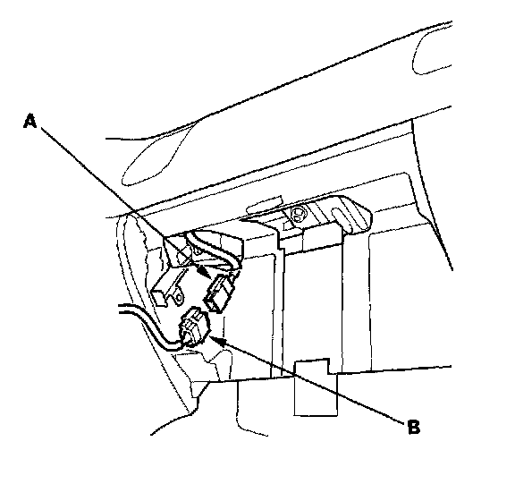 3. Remove the glove box, then disconnect the front passenger's airbag 2P or 4P connector (A) from the SRS main harness 2P or 4P connector (B).