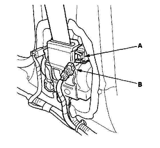 5. Disconnect both seat belt tensioner 2P connectors (A) from the side wire harness 2P connector (B).