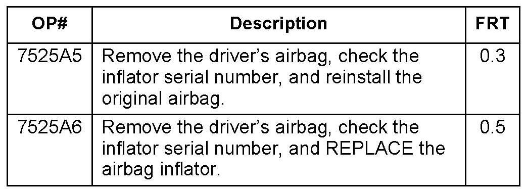 ^ If the airbag inflator is replaced, to avoid non-payment of warranty claims, the 13-digit serial number on the box of the new airbag inflator must be entered in the Diagnostic Trouble Codes field on each warranty claim. For more information, refer to step 1 of REPAIR PROCEDURE B.