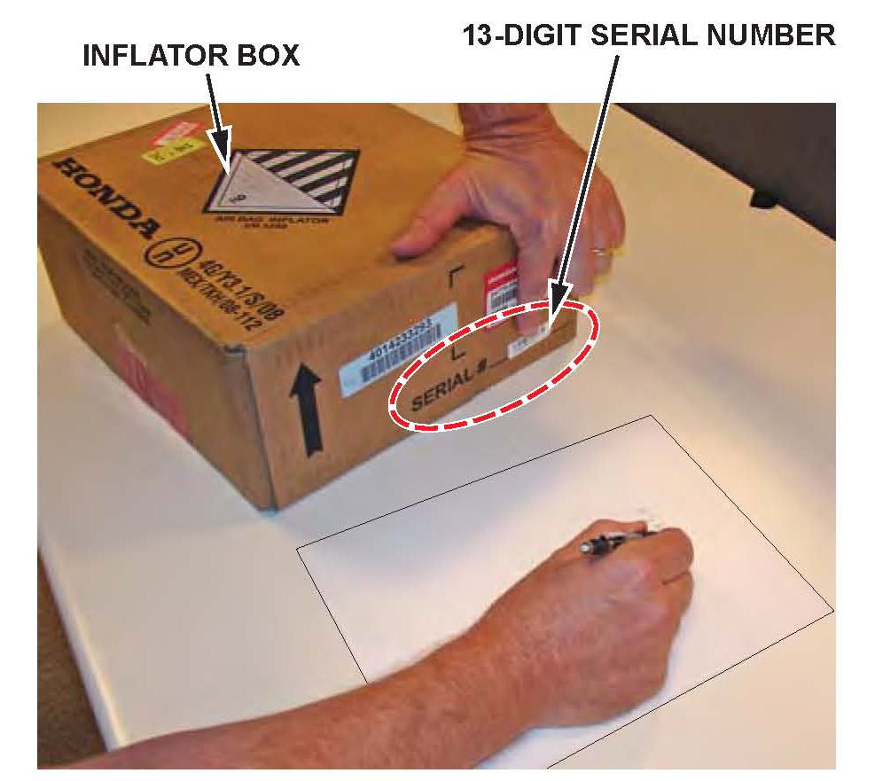 1. Write down the 13-digit serial number located on the right side of the new airbag inflator's box. For the warranty claim to be paid, your warranty clerk must enter this 13-digit serial number in the Diagnostic Trouble Codes field on the warranty claim.