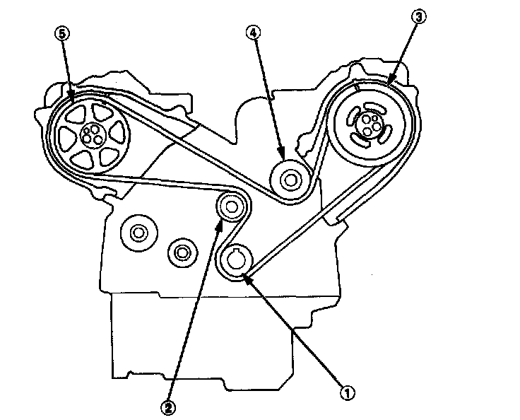 (1)Timing belt drive pulley (crankshaft) -> (2) Adjusting pulley -> (3) Left camshaft pulley -> (4) Water pump pulley -> (5) Right camshaft pulley.