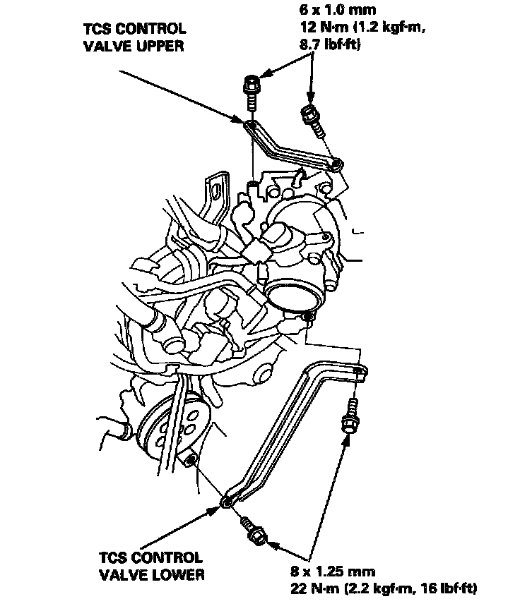 7. Disconnect the TCS throttle sensor connector, the TCS throttle actuator connector, and the throttle position (TP) sensor connector, then remove the TCS control valve assembly.